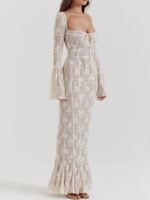 Crafted from delicate lace. this maxi dress boasts intricate floral patterns that create a captivating and graceful look. The cream color adds a touch of vintage charm. making it a perfect choice for weddings. special events. or any occasion where you want to make a lasting impression.